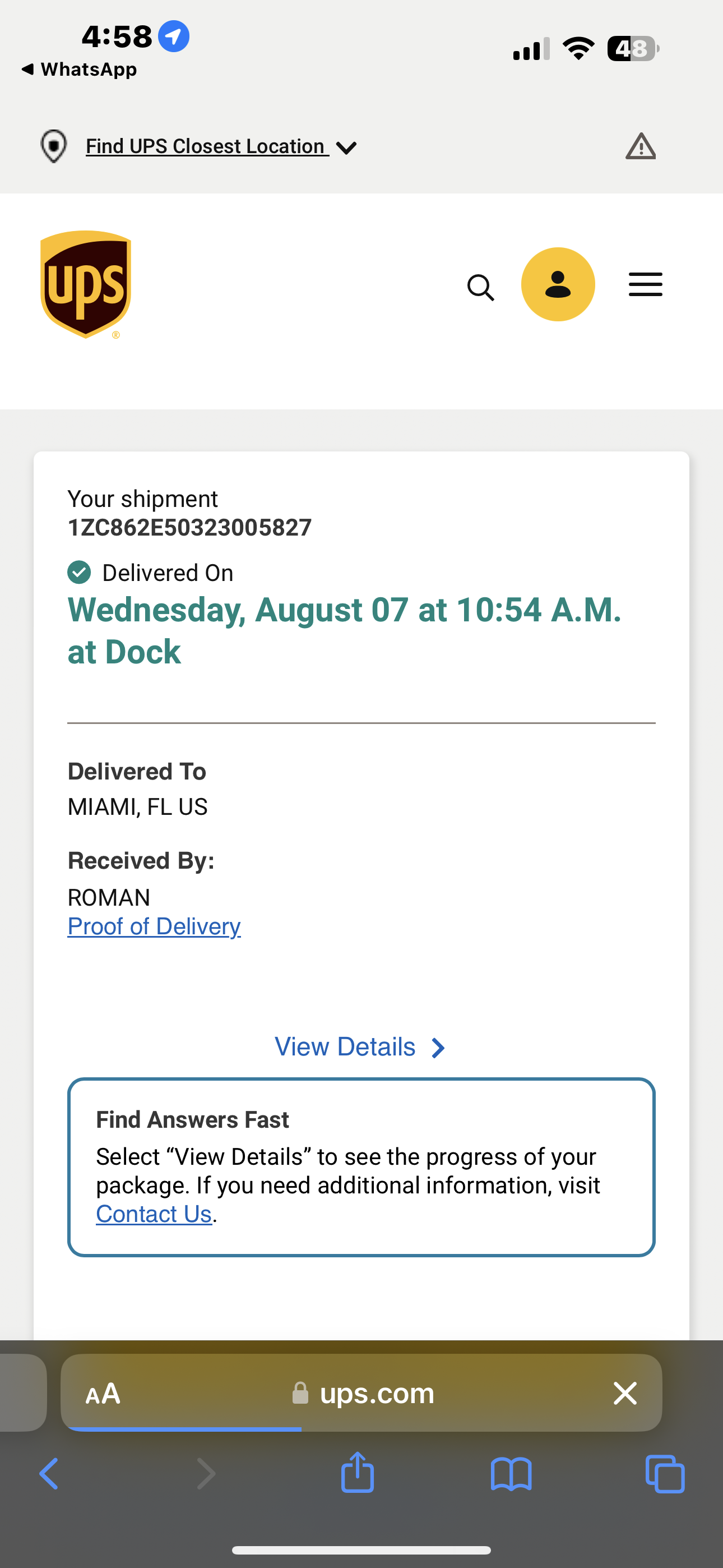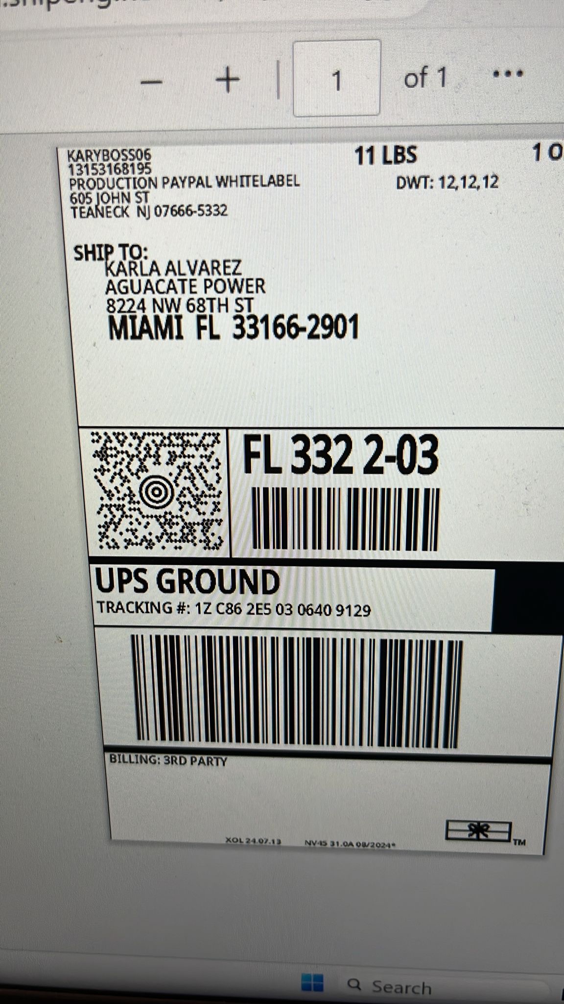 1. Captura de pantalla del número de seguimiento (1ZC862E50323005827)